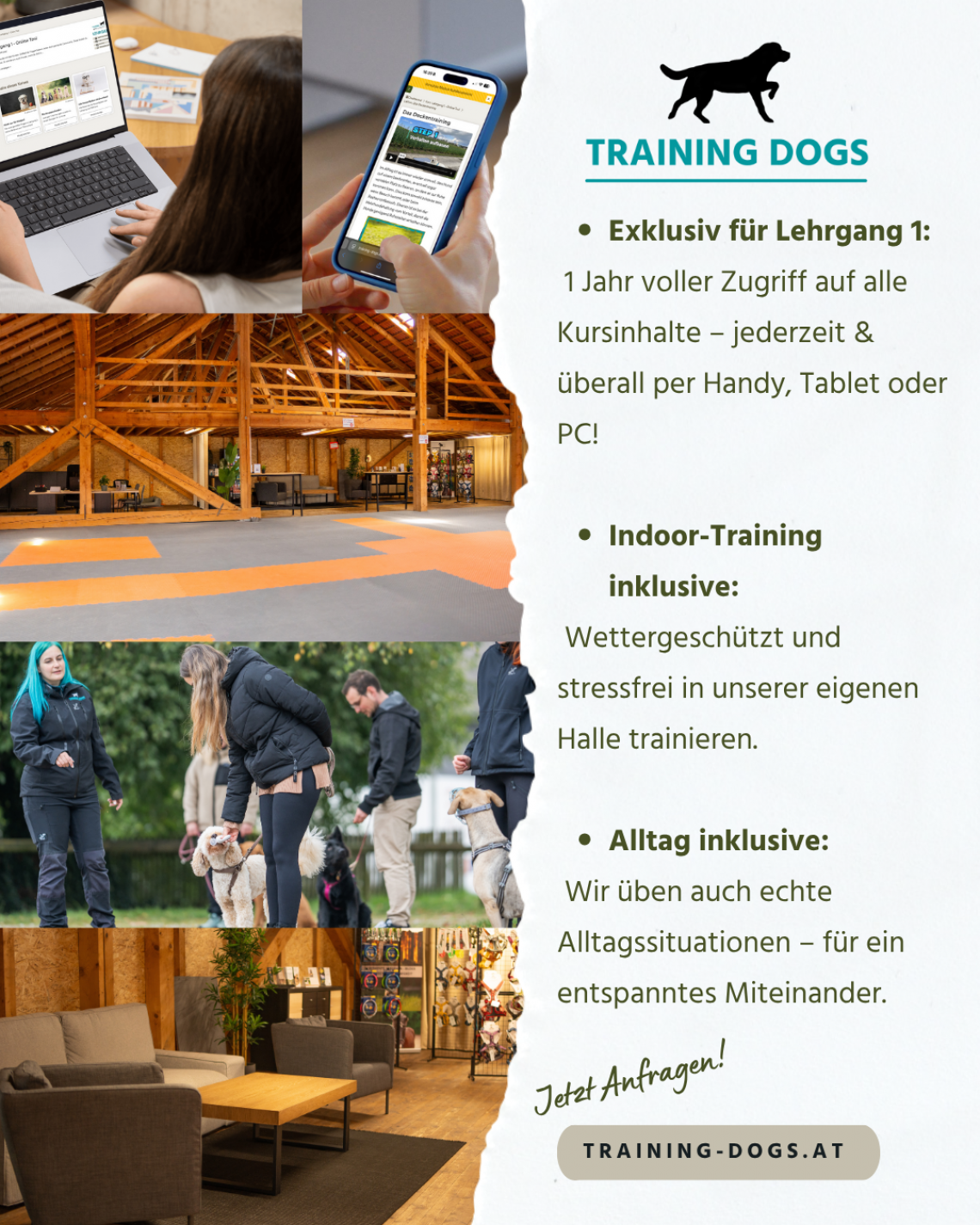 In unserem Lehrgang bieten wir in drei Monaten die Grundsteine für eine harmonische Mensch-Hund-Beziehung. Selbst wenn du bereits Erfahrung hast, schaffen wir eine unterstützende Umgebung, um gemeinsam die Fähigkeiten zu vertiefen und weiterzuentwickeln.